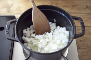 しんなりしたら水1/2カップ、洋風スープの素、ローリエを入れて弱火で5分煮る。