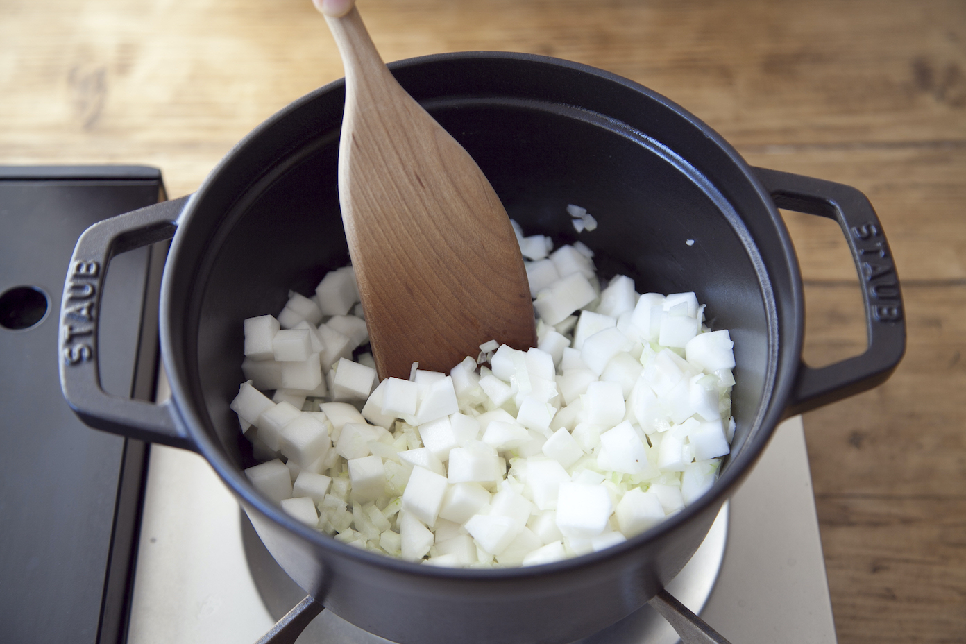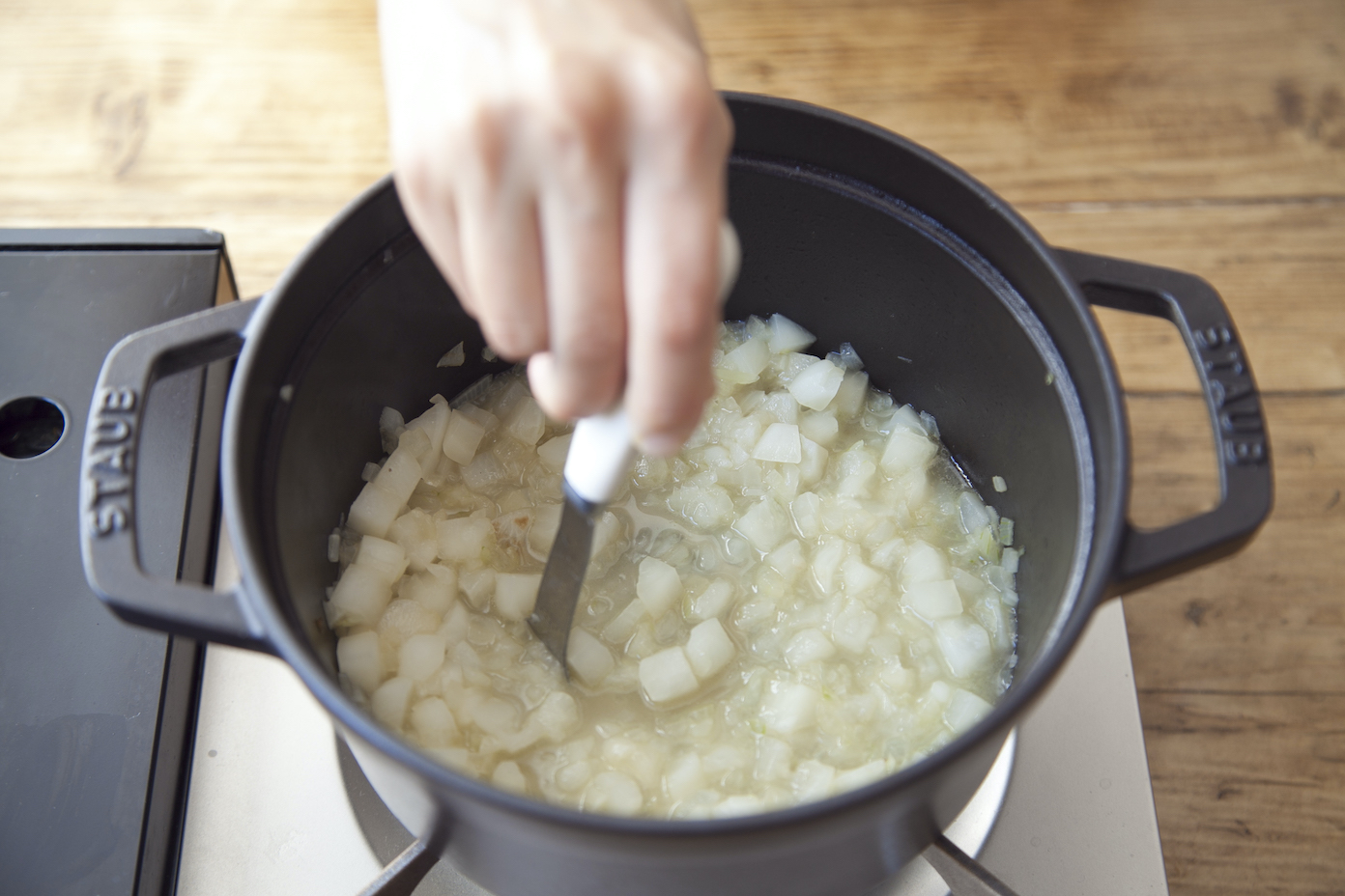 鍋にバターを中火で温め、玉ねぎ、かぶを炒める。