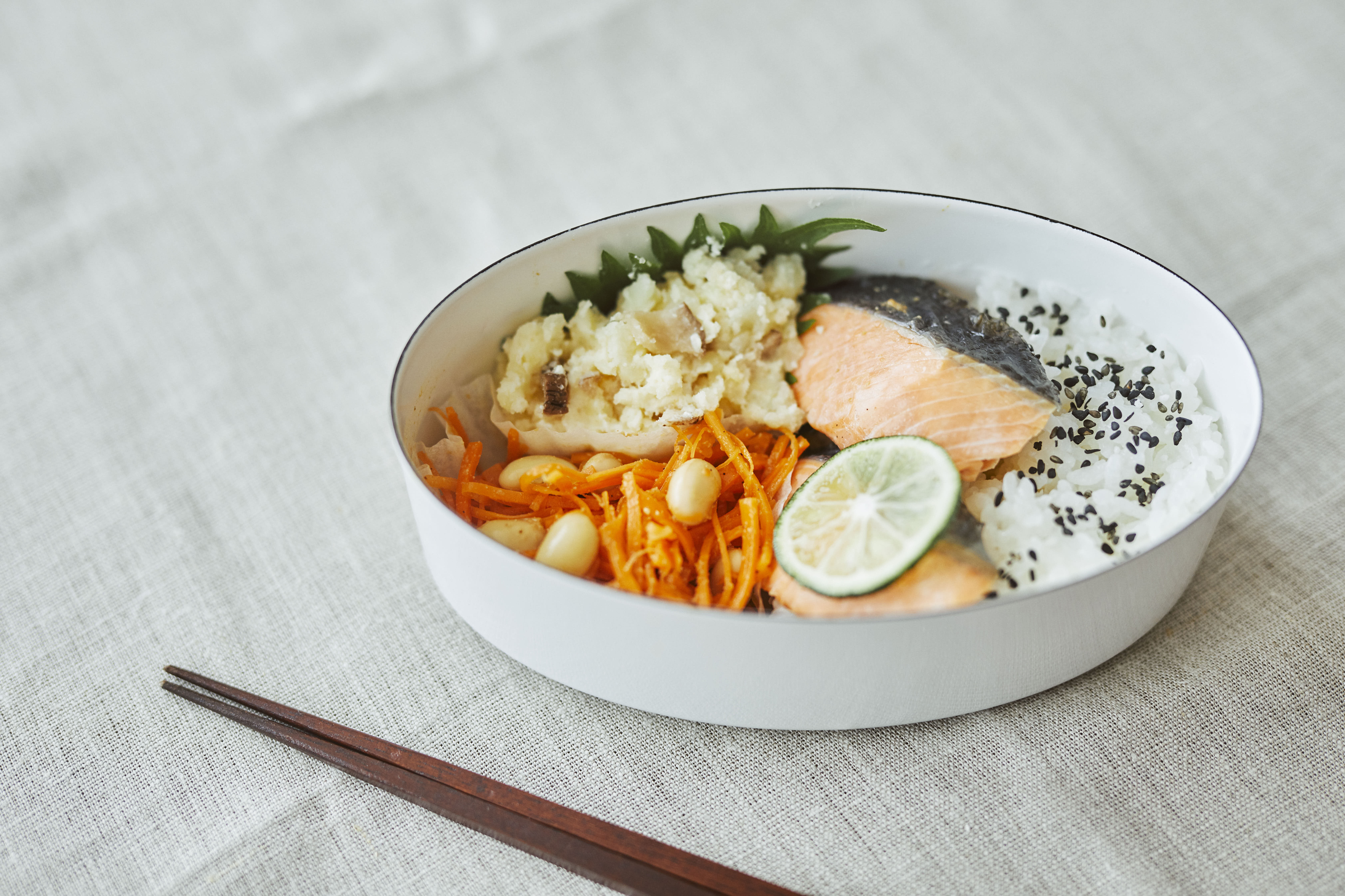 大豆の水煮とたっぷりのすりごまを使うことで、にんじんラペを焼き魚にも合う和風に仕上げました。