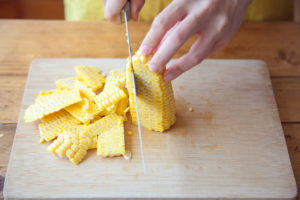 まな板の上に立てて包丁で実を削ぐように切り取る。