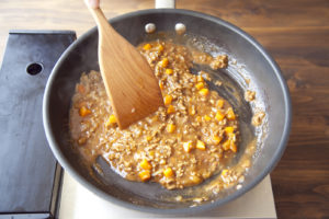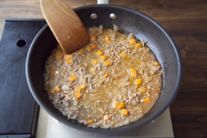 玉ねぎがしんなりしたらにんじん、合挽き肉を加え炒め、ひき肉の色が変わったら、水1/2カップ、トマトケチャップを加えて3分煮る。