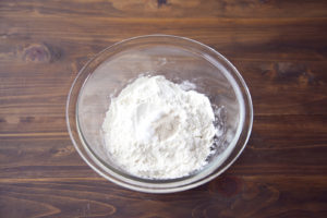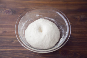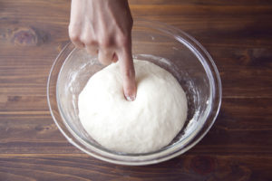 生地が2倍程度の大きさになり、打ち粉(強力粉/分量外)をつけた指で穴をあけて生地戻ってこなければ発酵完了。