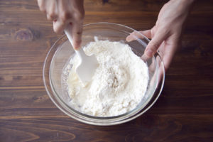 ゴムべらで混ぜ、全体がまざったら、ひとまとまりになるまで手で混ぜ合わせる。