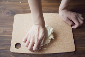 生地を台の上に出して、叩きつけながら、手のひらを使って手前から奥に押し、戻して90度返して同じように手前から奥に押すようにしてこねる。