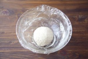 5〜10分ほどこねてなめらかになったら丸めてボウルにもどし、ラップをかけてオーブンの発酵機能(35℃)で40分〜1時間程度発酵させる。