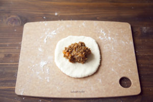 生地を麺棒で丸くのばしてカレーを1/4量ずつのせ、半分におって綴じ目をしっかり閉じる。