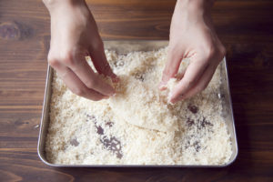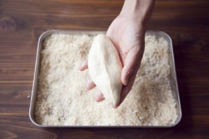全体に霧吹きをしっかりかけ、パン粉をまぶす。クッキーングシートの上に綴じ目を下にしておく。