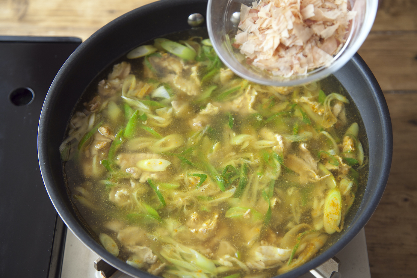 かつお節をいれることでおだしの旨みをさらに濃厚に、