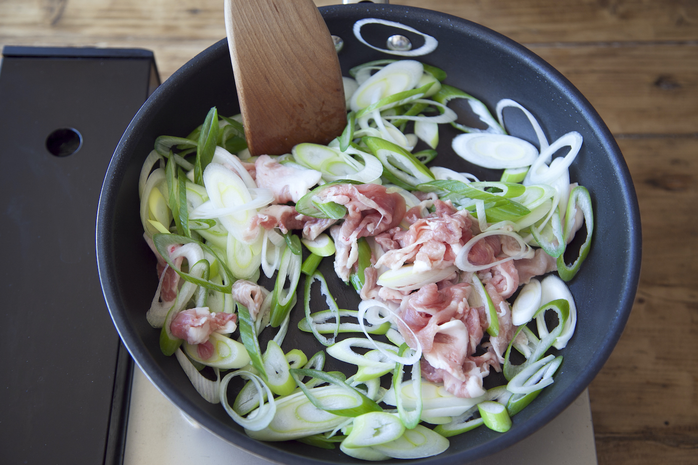 フライパンにサラダ油を熱し、中火で長ねぎ、豚肉を炒める。