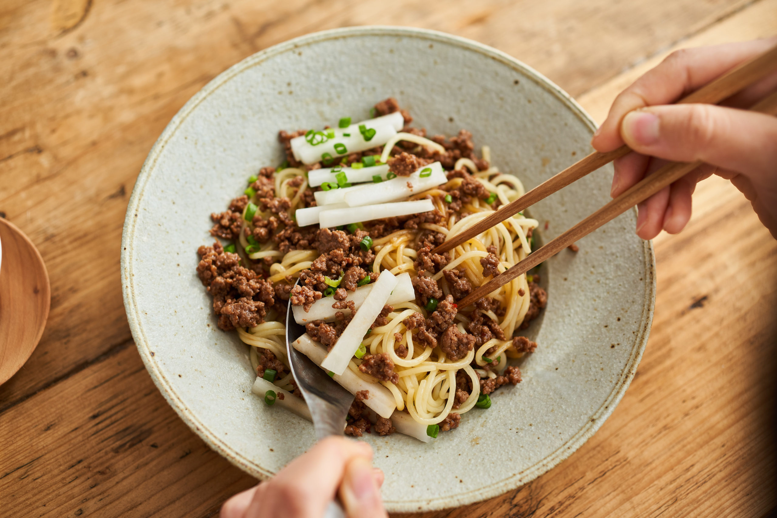 器に袋の表示通りに加熱した麺、2、大根、万能ねぎをのせ、和えながら食べる。