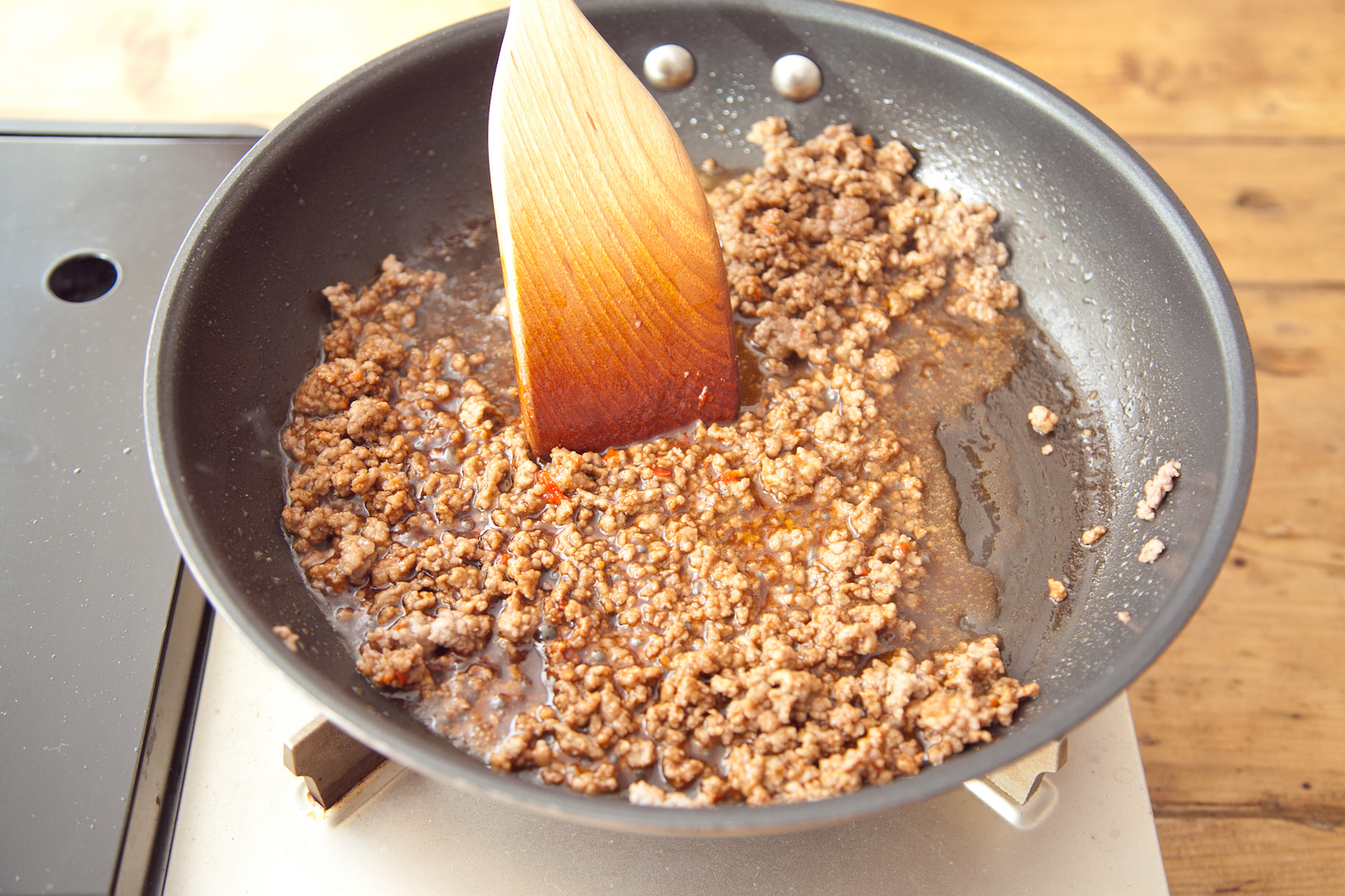 フライパンにごま油を熱し合い挽き肉を炒める。(A)を加え炒める。