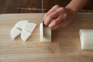 【1】大根は厚さ1cmのいちょう切りにする。