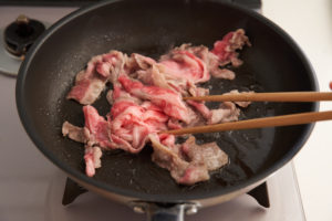 【2】フライパンにサラダ油を熱し、牛肉を炒めて取り出す。同じ鍋に大根を入れ、1分ほど炒める。