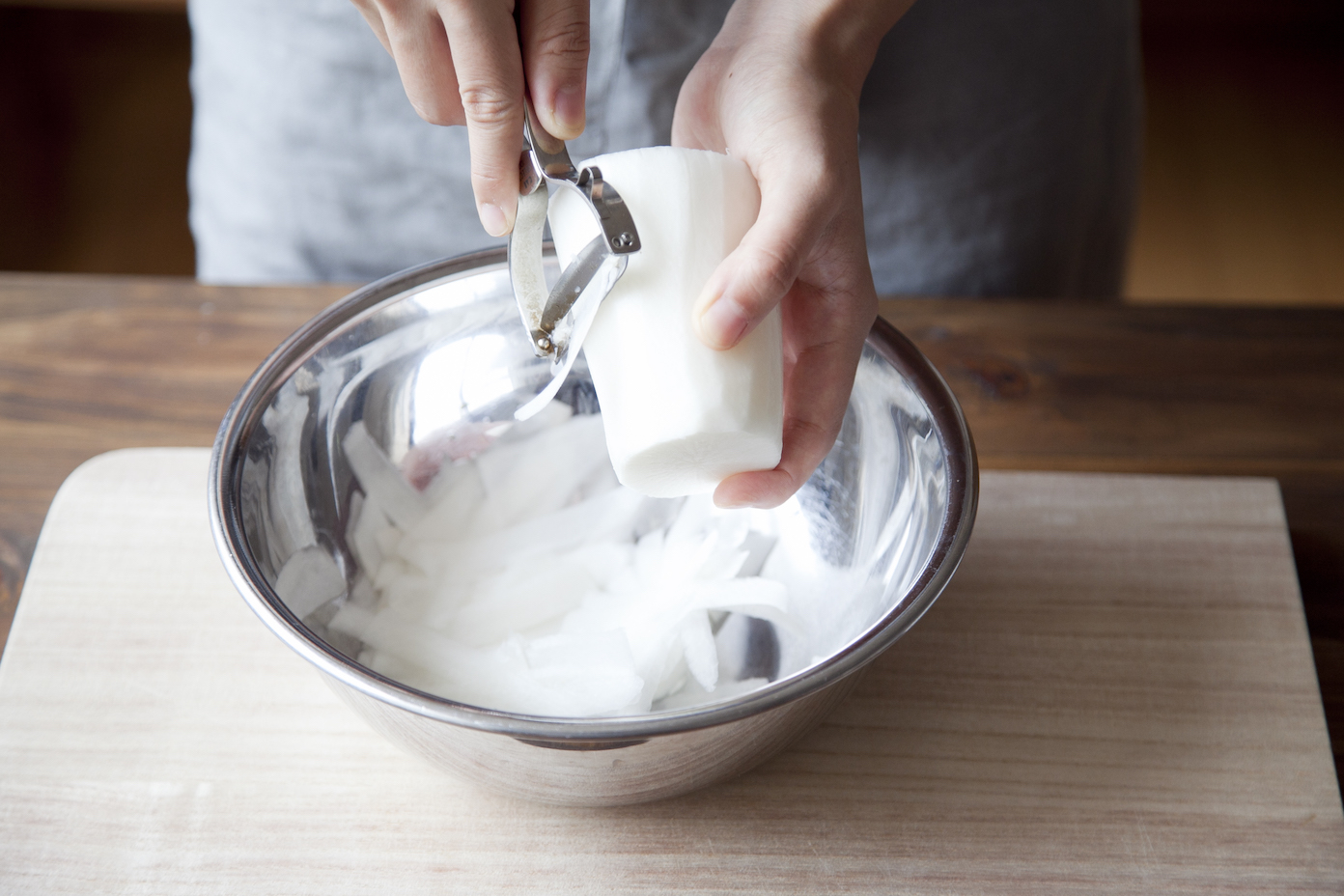 大根はピーラーで皮をむき、同様に実を削るようにリボン状にする。
