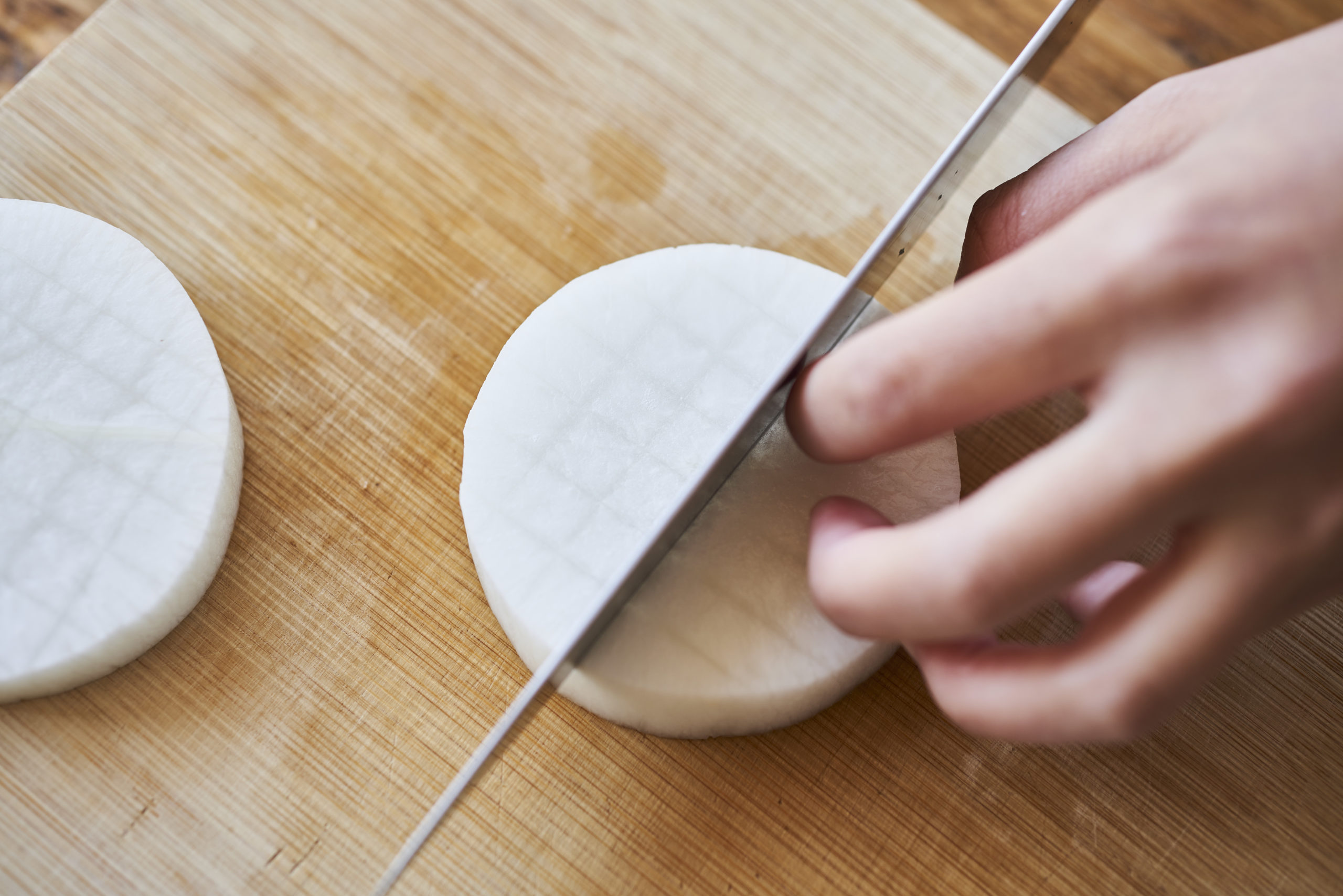 大根は皮をむき、1.5cmの厚さに切り、両面に格子状に切り込みいれる。