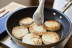 フライパンにオリーブオイルを弱めの中火で熱し、大根をいれて蓋をして7〜8分焼き色がつくまで焼く。