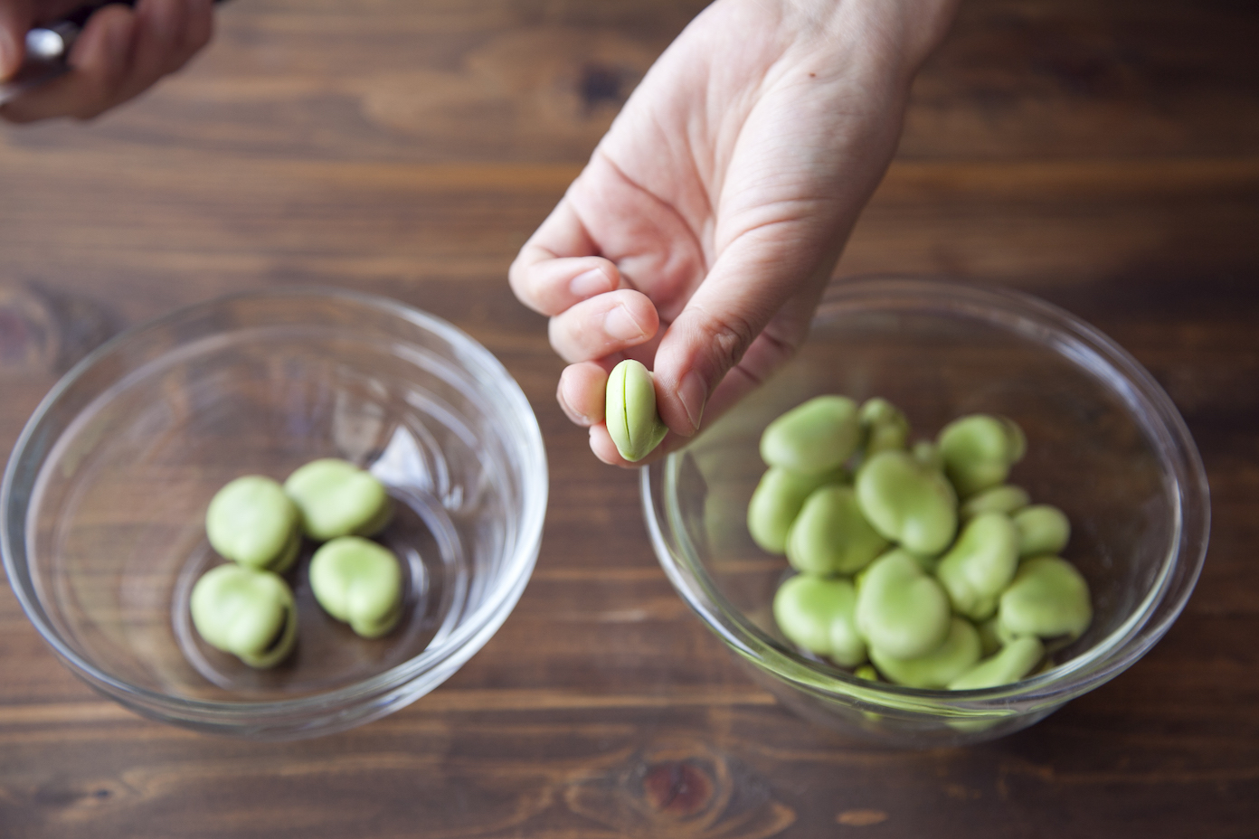そら豆はさやから出して、黒い部分と反対に切り込みを入れ、