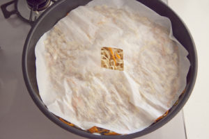 クッキングペーパーを四つ折りにして、フライパンの大きさに切り、中心を切り取り落し蓋を作っておく。