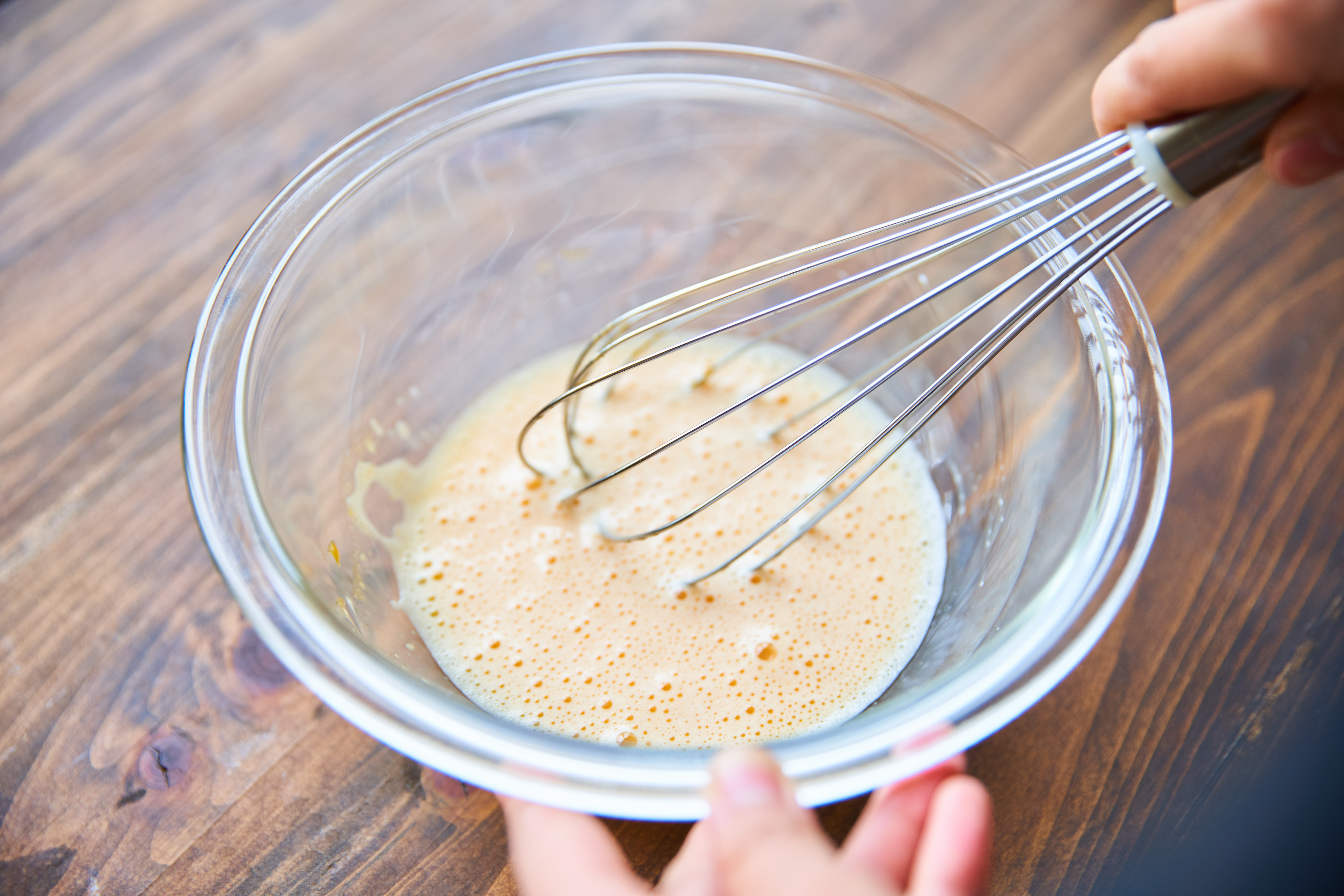 ボウルに卵黄、はちみつを入れて泡立て器でよく混ぜ、牛乳を少しずつ加えさらに混ぜる。
