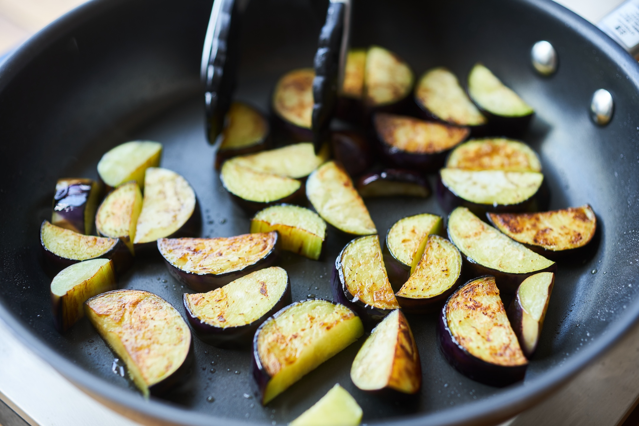 フライパンにオリーブオイルを強めの中火で熱し、2のなすを焼く。