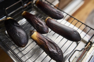 なすをグリルに入れて加熱し、10分ほどしっかり全体が焦げて、やわらかくなるまで焼く。
