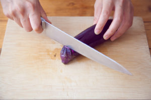 なすはヘタの周りに包丁でぐるりと切り込みを入れる。