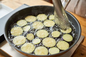 フライパンに1cmの深さに油を注ぎ、180度に熱し、なすを入れる。