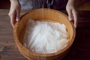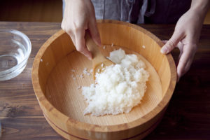 熱いごはん300g に合わせ酢(米酢小さじ4、砂糖小さじ2 強、塩小さじ1 弱)を混ぜ合わせ、ぬれ布巾をかけておく。