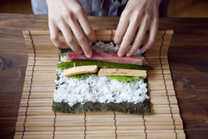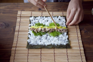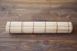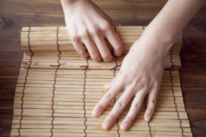 すし飯の端と端を合わせるように巻きすでしっかりと巻く。