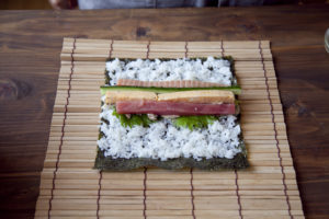 巻くとすし飯がぎゅっと締まるため、海苔がすける程度に薄めに敷きます。)