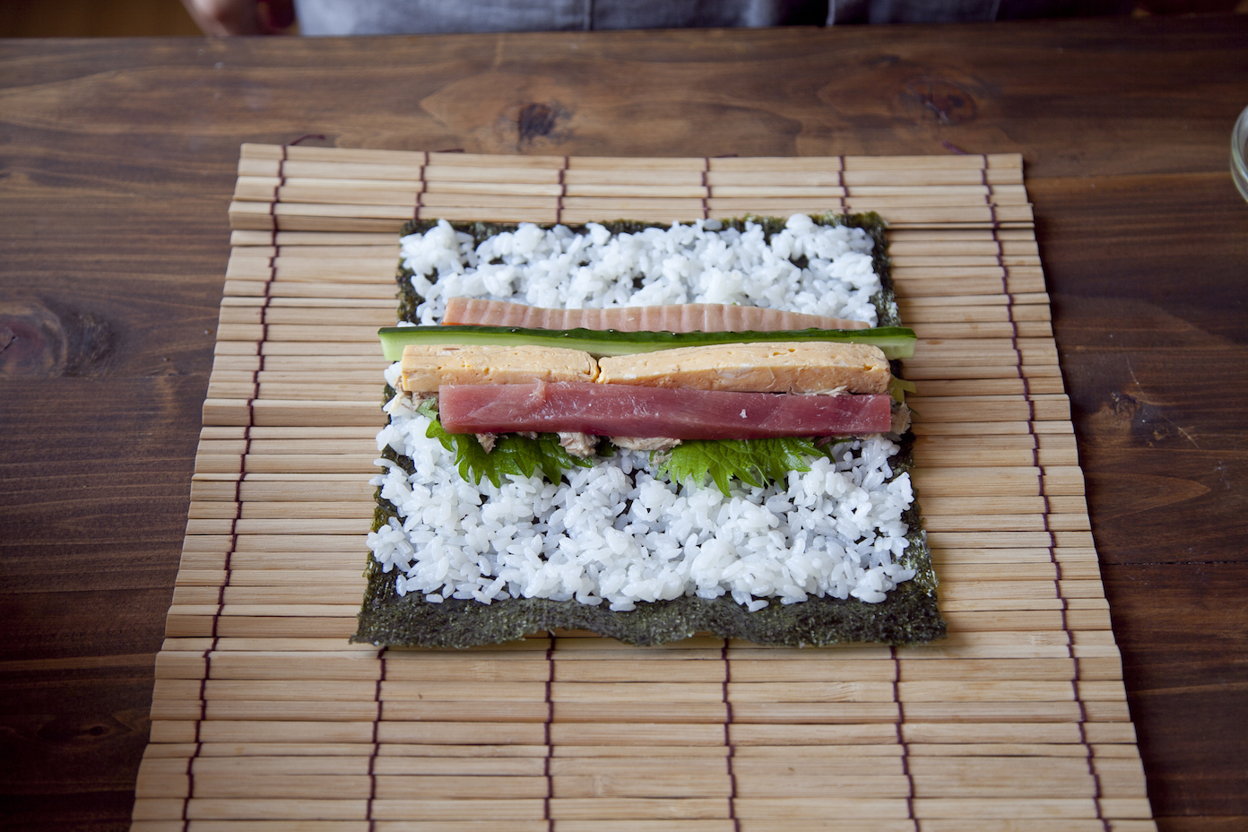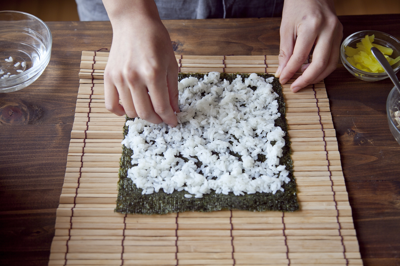 巻くとすし飯がぎゅっと締まるため、海苔がすける程度に薄めに敷きます。)