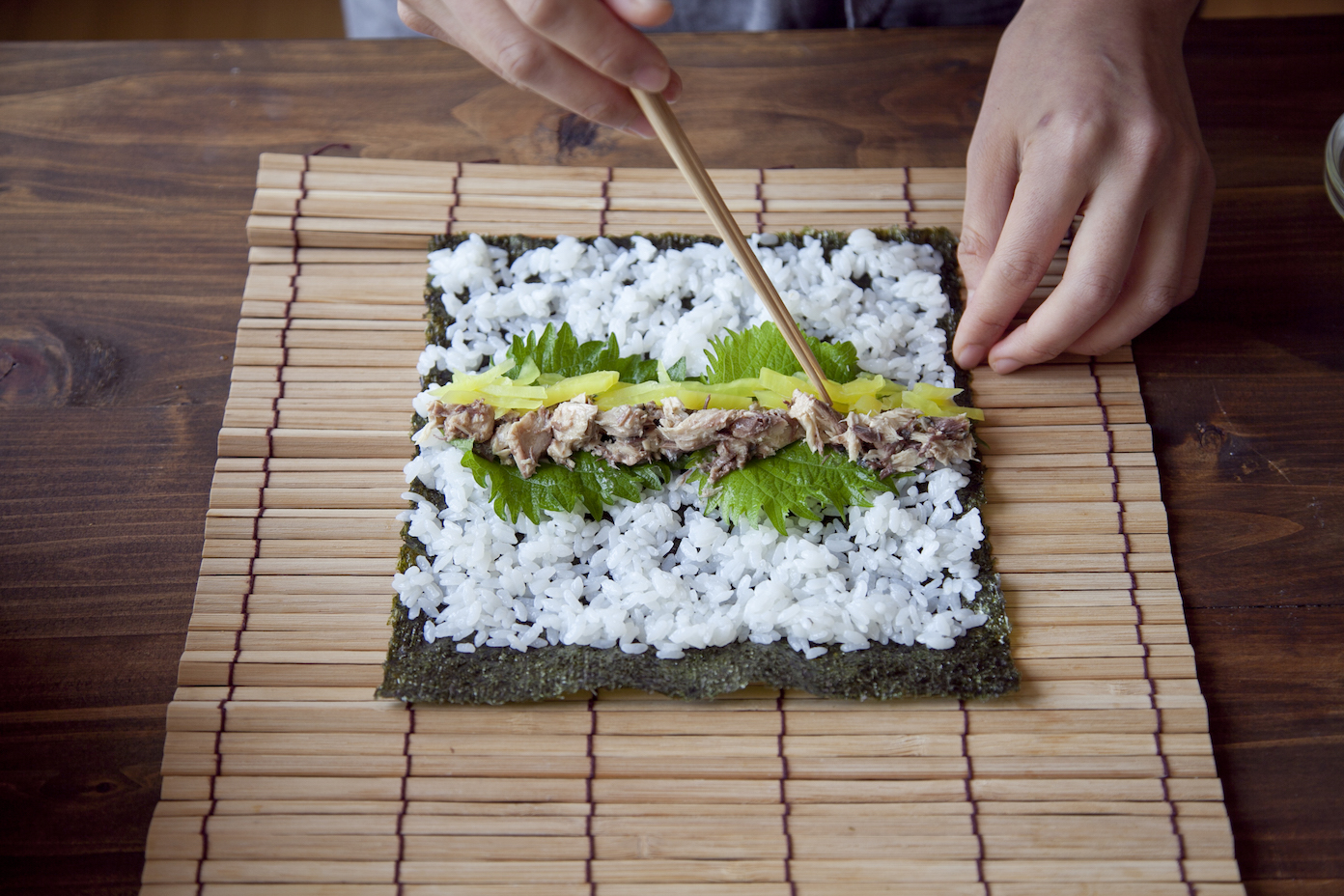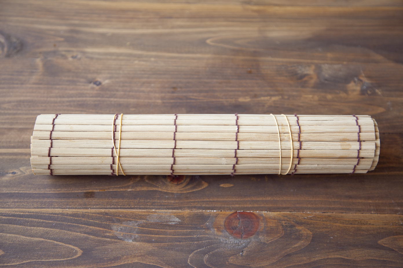 (※巻きすで巻くときは、空いている指で具材を抑えながら巻くと巻きやすいです。)