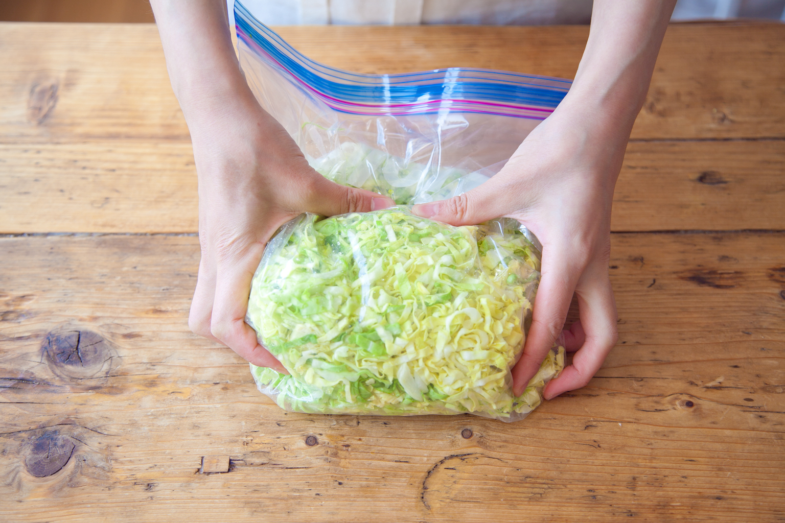 キャベツは千切りにしてジッパー付き保存袋に入れる。