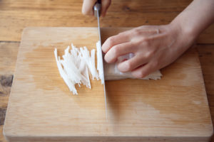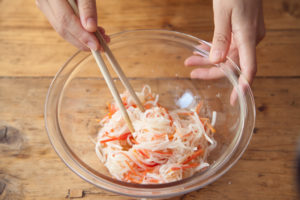 大根、にんじんは皮をむき、千切りにし、塩麹をよく揉み込んで5分おく。