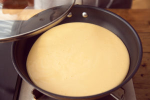 フライパンをごく弱火にかけ、1を流し入れ、蓋をして13分程度加熱する。