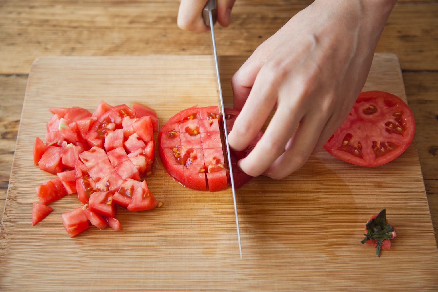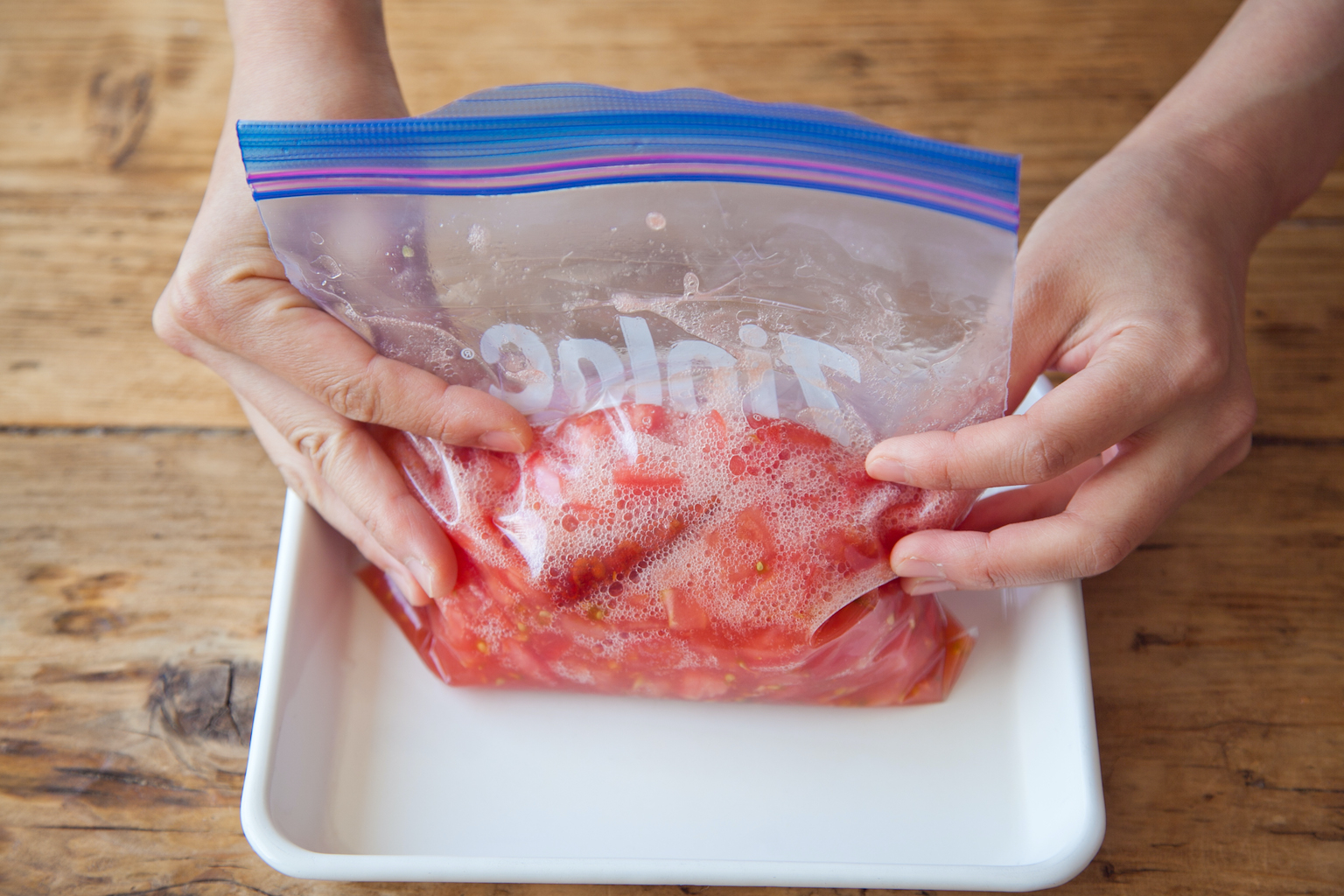トマトは1.5cmの角切りにし、ジッパー付き保存袋に入れる。