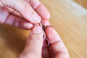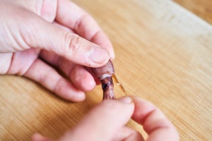 胴の下の切れ目から爪で引っ掛けて軟骨を取り除く。