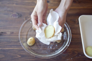 新じゃがいもは洗って半分に切り、水気がついたまま耐熱皿に入れる。