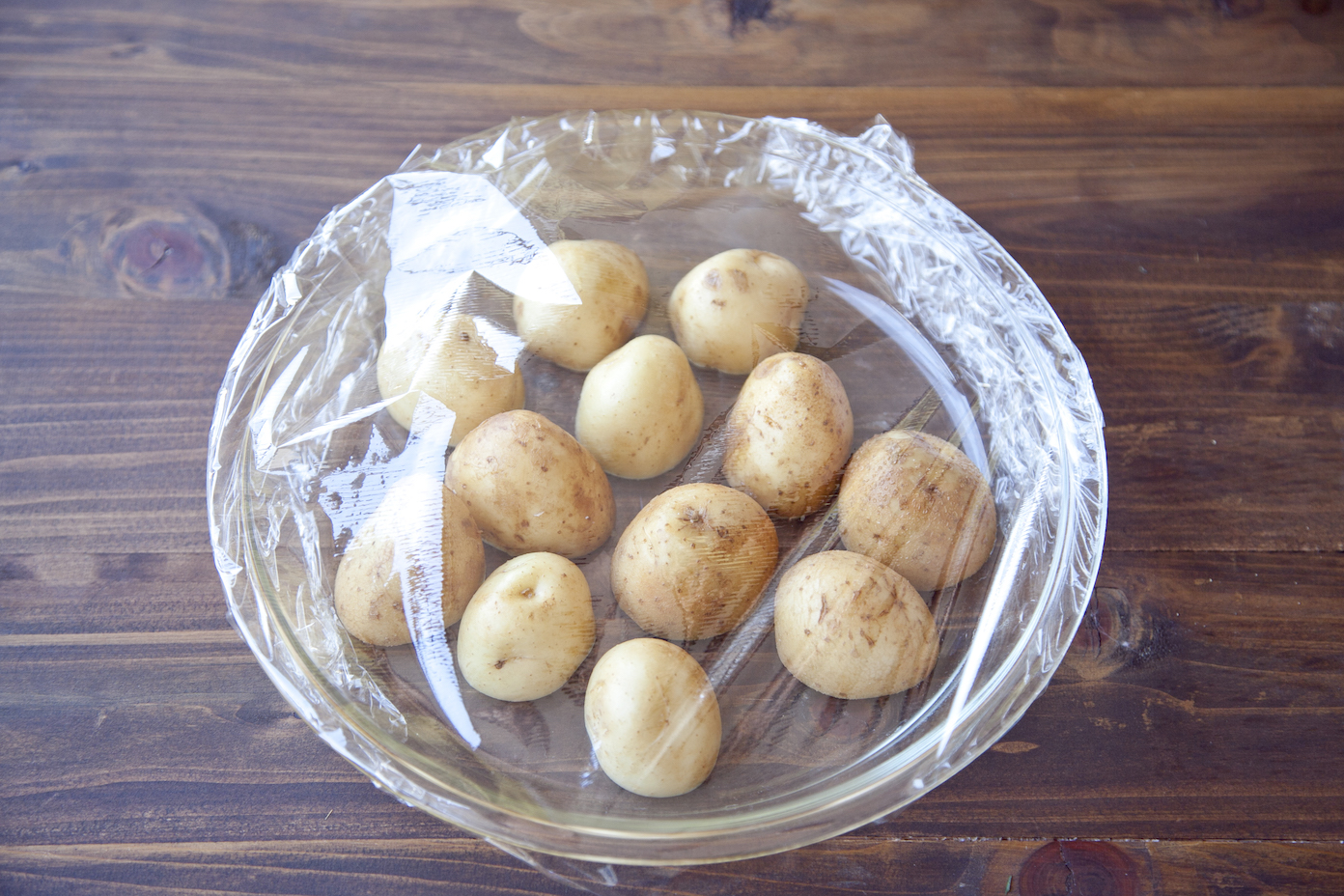 新じゃがいもは洗って半分に切り、水気がついたまま耐熱皿に入れる。