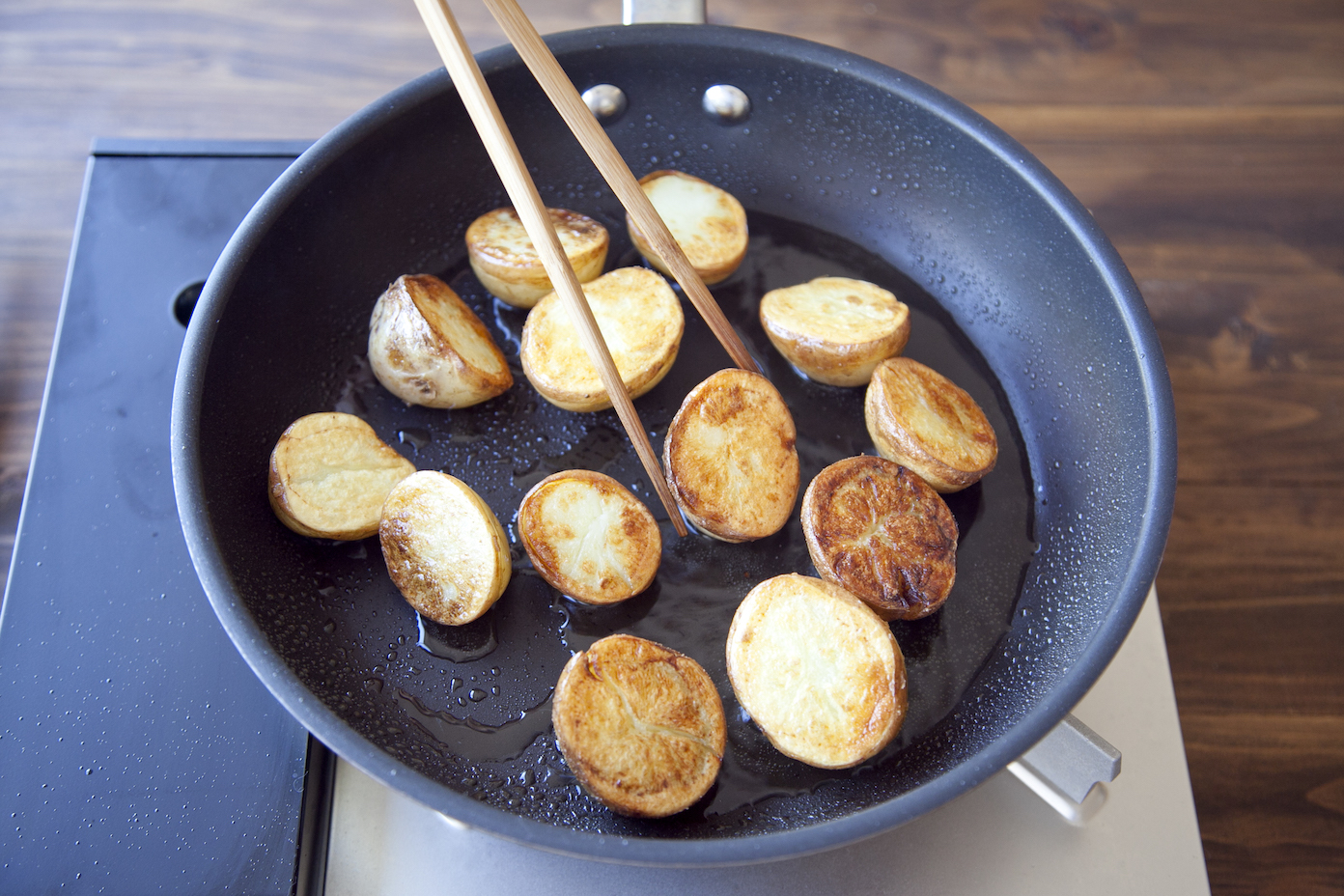 揚げ焼きをしているときはあまり触らないことで、きれいな焼き色をつけることができます。