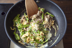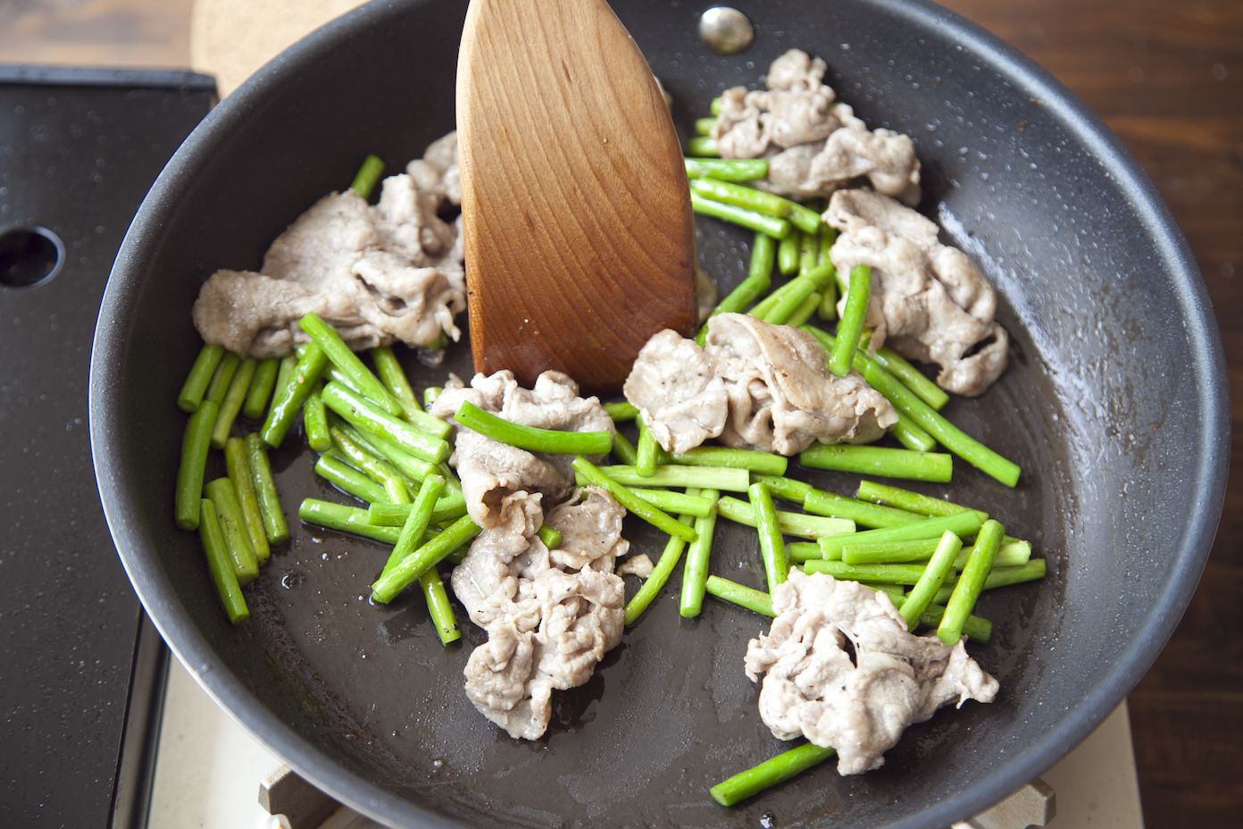 豚肉に火が通ったらニンニクの芽を加え炒め、3分ほど炒める。