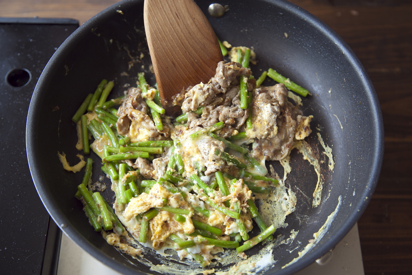 残りのごま油を加え、温まったら溶いた卵、しょうゆを加え軽く混ぜ、