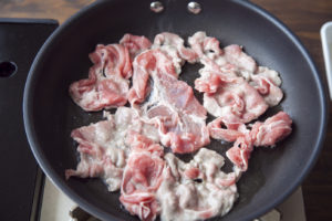 フライパンにごま油大さじ1を中火で熱し、豚肉を広げ入れ、