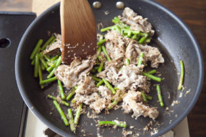 ニンニクの芽がしんなりとしてきたらかつお節を加え混ぜる。