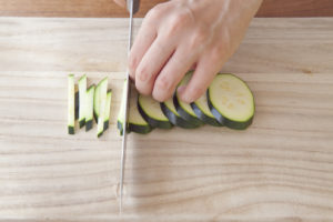 ズッキーニは厚さ5mm程度の斜め薄切りにしてから、