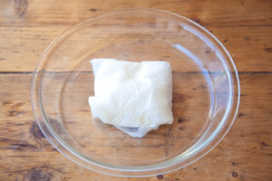 電子レンジ600Wで3分加熱し、粗熱が取れたら新しいキッチンペーパーに二重に包み15分おいて水切りする。