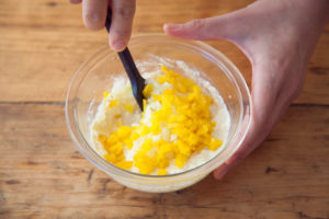 ボウルに1を入れ、(A)を加えて泡立て器でなめらかになるまで混ぜ、