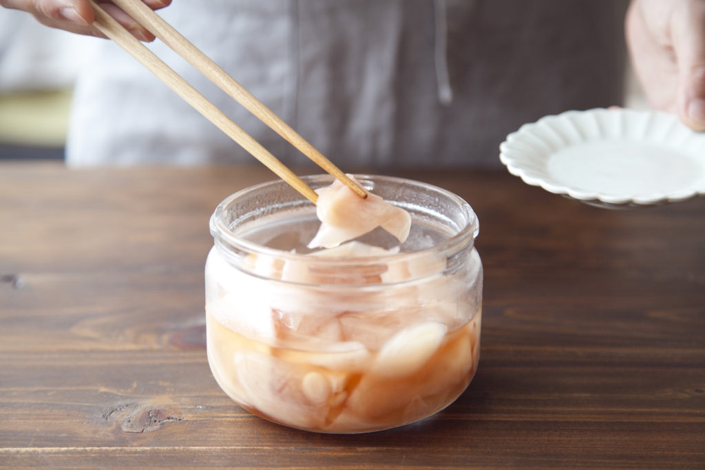 清潔な瓶に2の生姜、甘酢を入れてなじませ、冷蔵庫に一晩おく。