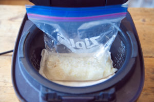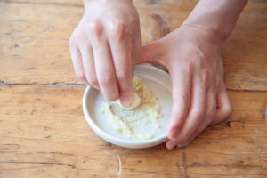 清潔なジッパー付きの保存袋に米麹、にんにく、粗塩、水1/2カップ(乾燥麹の場合は120mlが目安)