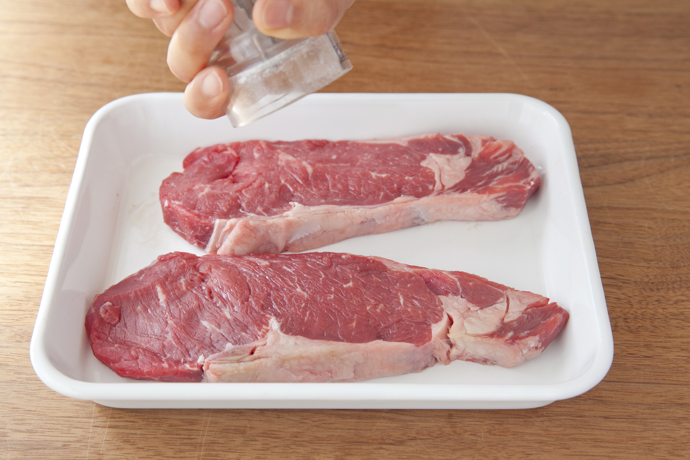 牛肉は焼く30分程度前に冷蔵庫から出し、常温に戻しておく。